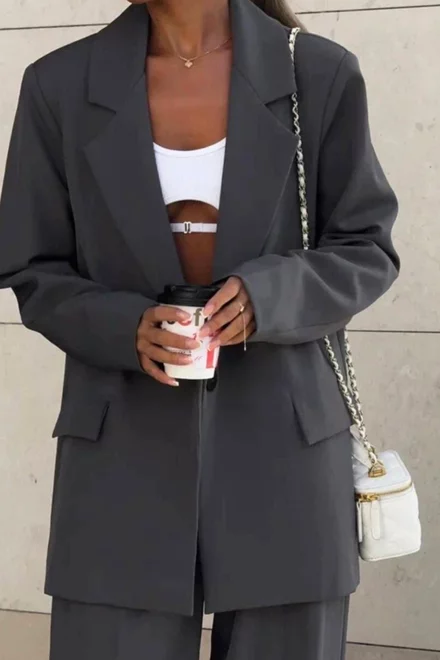 Costum de Dama, din Doua Piese, Sacou si Pantalon Lejer din Bistrech, Emporryo, Gri
