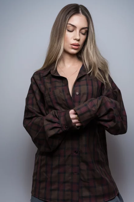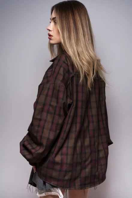Camasa Oversize de Dama, in Carouri, cu Inchidere Nasturi, Jannet, Burgundy