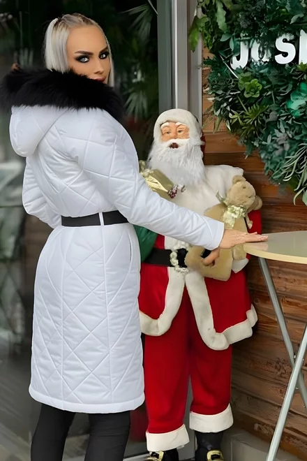 Geaca Lunga de Dama, din Fas Matlasat, cu Cordon si Blana Neagra Detasabila, Melania , Alba