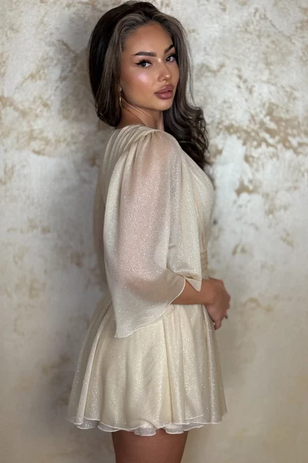 Rochie Eleganta de Dama, cu Fir Lurex, Maneci Evazate si Fusta Pantalon , Fabiolla , Aurie