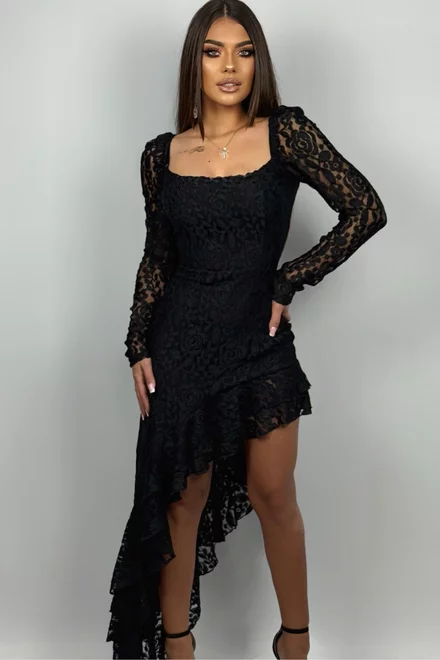 Rochie de Dama, Asimetrica, cu Inchidere Fermoar si Maneci Lungi, din Dantela, Regalle, Neagra