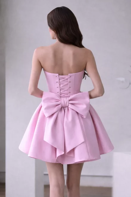 Rochie Scurta de Dama, din Satin, fara Maneci si Accesorizata cu Funda la Spate, Elyanora, Roz