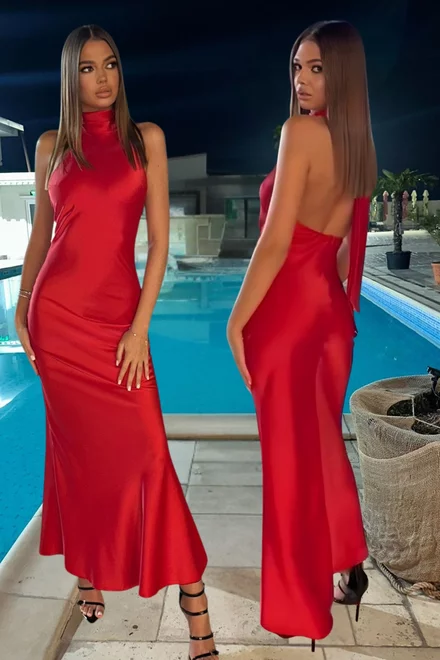 Rochie Lunga de Dama, cu Spate Gol si Inchidere Cordon Dupa Gat, Andalusse, Rosie