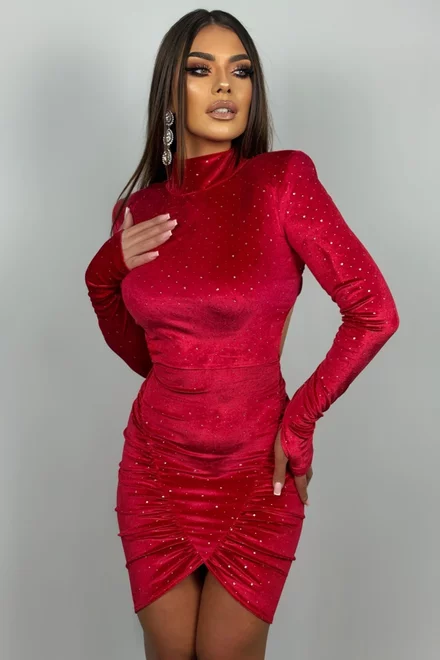 Rochie Eleganta de Dama, cu Glitter, Maneci Lungi si Spate Gol, Irenne, Rosie