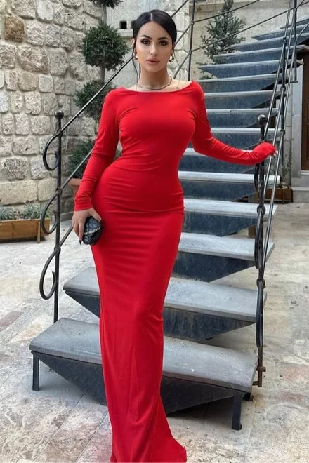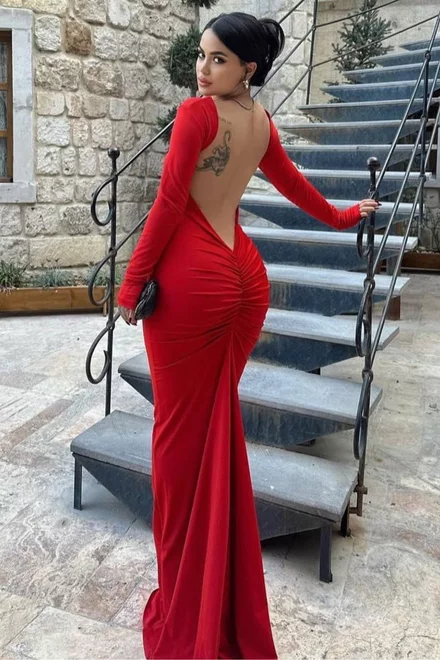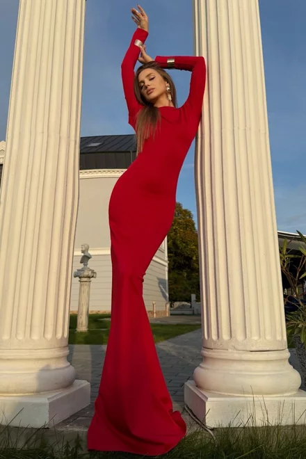 Rochie Lunga de Dama, din Lycra, cu Maneci Lungi si Spate Gol, Rossalinda, Rosie