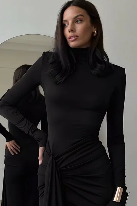 Rochie Lunga de Dama, din Lycra, Decupata pe Picior, cu Maneci Lungi, Versellya, Neagra