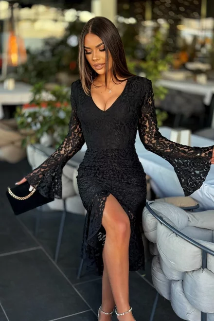 Rochie Midi de Dama, din Dantela, cu Maneci Lungi Tip Clopot si Inchidere Fermoar, Majestik, Neagra