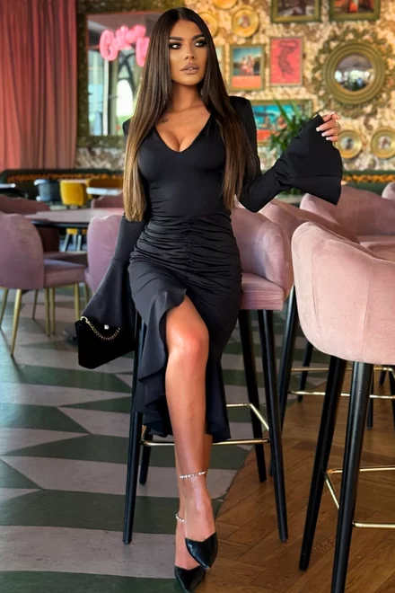 Rochie Midi de Dama, din Lycra, cu Maneci Lungi Tip Clopot si Volan, Andromedda, Neagra