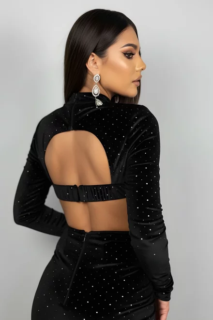 Rochie Scurta de Dama, din Catifea cu Glitter si Spate Gol, Maesttra, Neagra