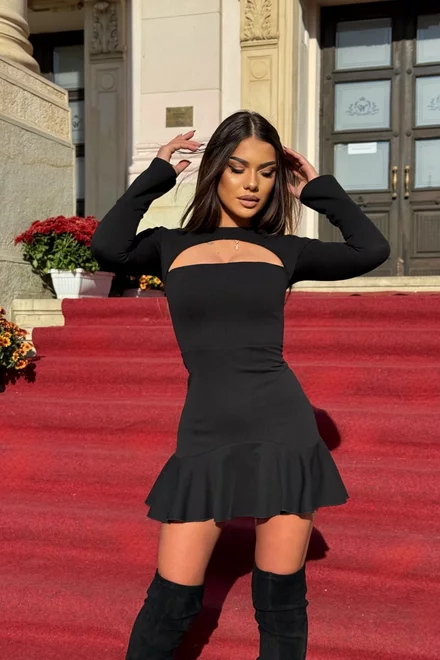 Rochie Scurta de Dama, cu Volan si Maneci Lungi Tip Clopot, Monalisse, Neagra