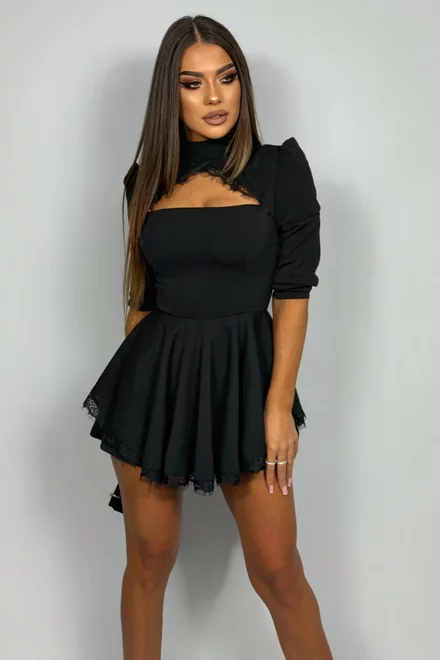 Rochie Scurta de Dama, cu Fusta-Pantalon, Accesorizata cu Dantela, Almirra, Neagra