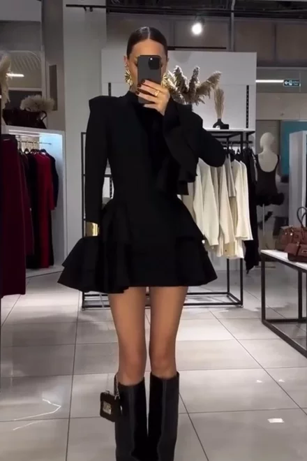 Rochie Scurta de Dama, cu Maneci Lungi Tip Clopot, Volane si Inchidere Fermoar, Denerrys, Neagra