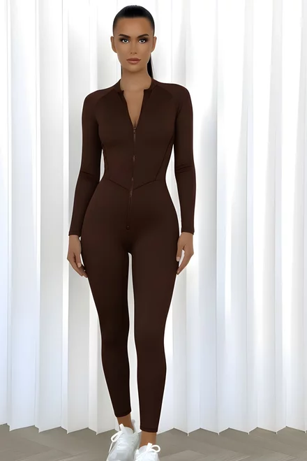 Salopeta de Dama, din Lycra, cu Maneci Lungi si Cusaturi Evidentiate, Plush, Maro Inchis