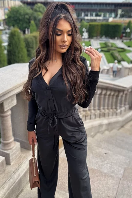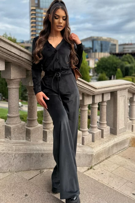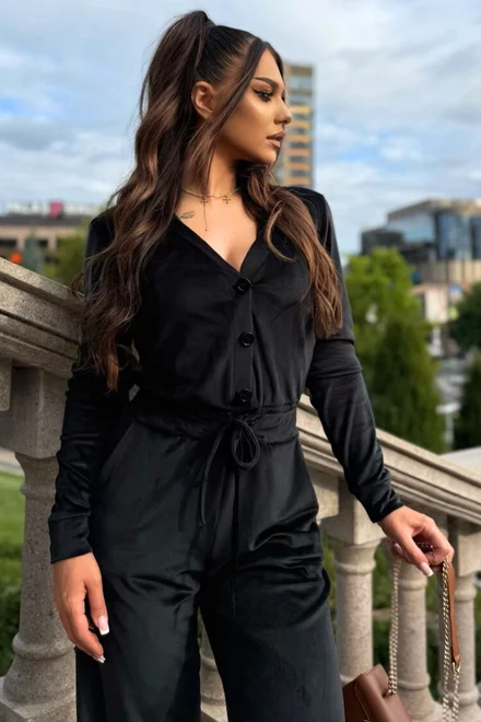Salopeta Lejera de Dama, din Catifea, cu Inchidere Nasturi si Snur Reglabil in Talie, Morenna, Neagra