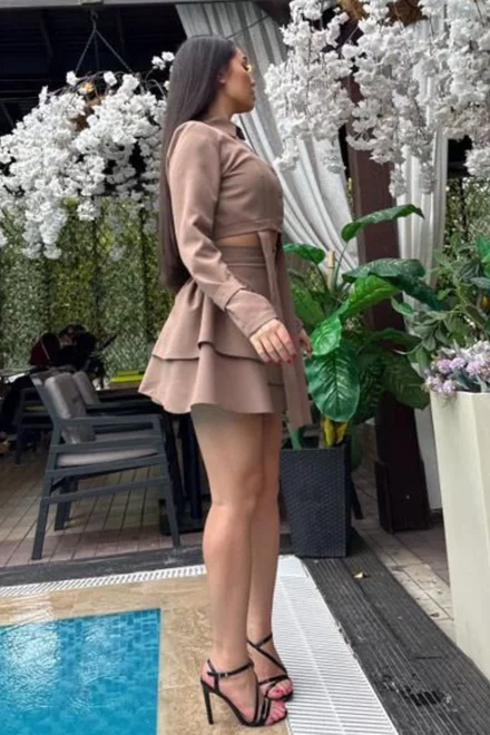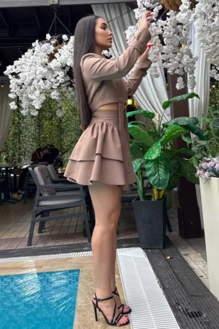 Compleu de Dama, din Bistrech, Sacou Scurt si Fusta cu Volane, Errika, Cappucino