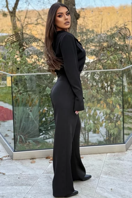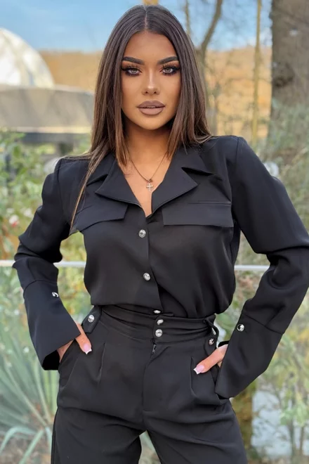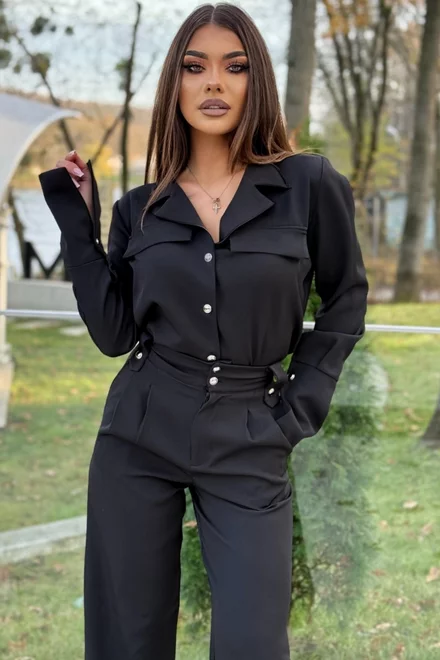 Compleu de Dama, din Doua Piese, Camasa cu Inchidere Nasturi si Pantalon cu Talie Inalta, Hermossa, Negru