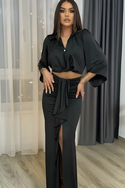Compleu de Dama, din Doua Piese, Camasa cu Maneci Evazate si Fusta Accesorizata cu Volane, din Lycra, Eclipse, Negru