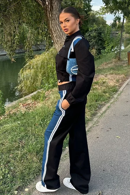 Compleu de Dama, din Doua Piese, cu Insertie de Blug si Dungi Albe in Contrast, Bellvedere, Negru
