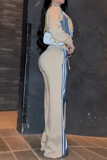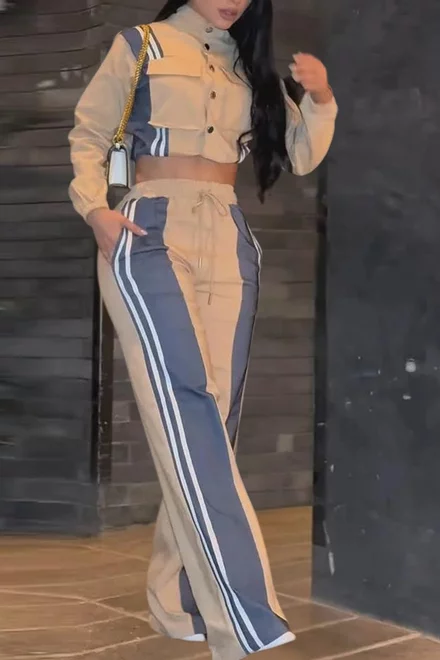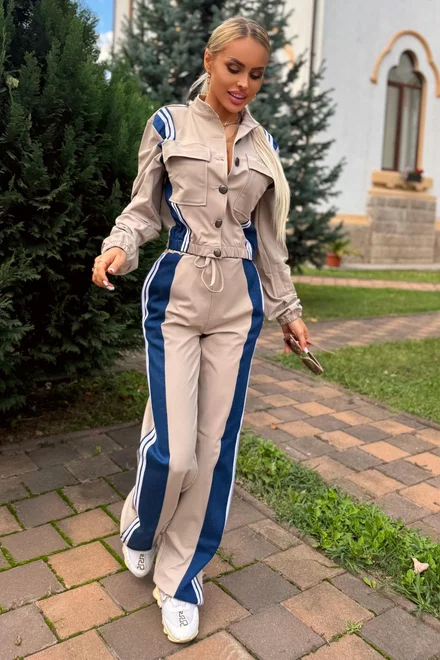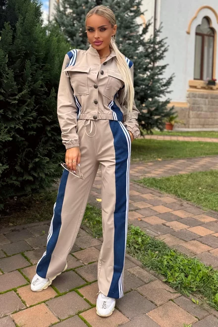 Compleu de Dama, din Doua Piese, Jacheta Scurta cu Inchidere Nasturi si Pantalon cu Insertie Blug, Preciosso, Bej