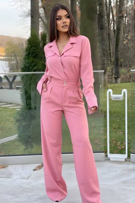 Compleu de Dama, din Doua Piese, Pantalon cu Talie Inalta si Camasa cu Nasturi, Corallia, Roz Bon-Bon