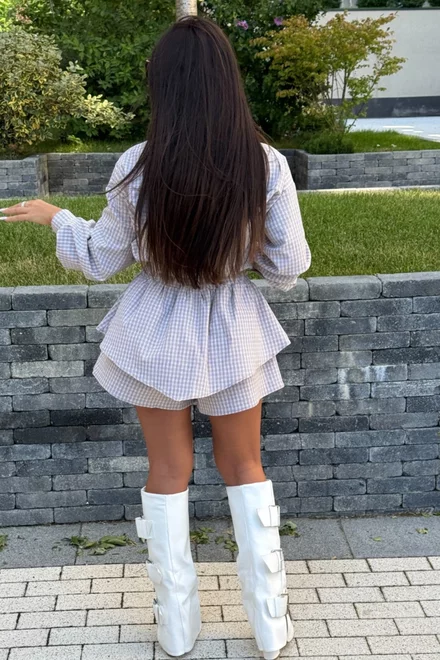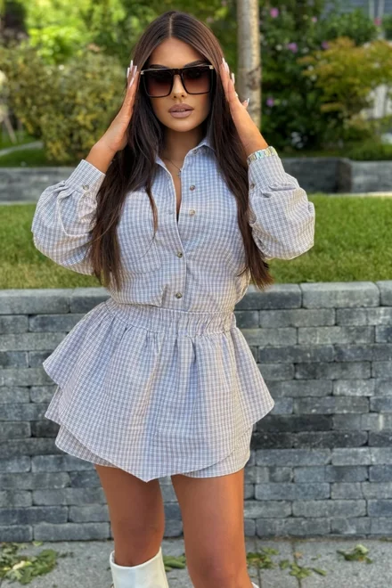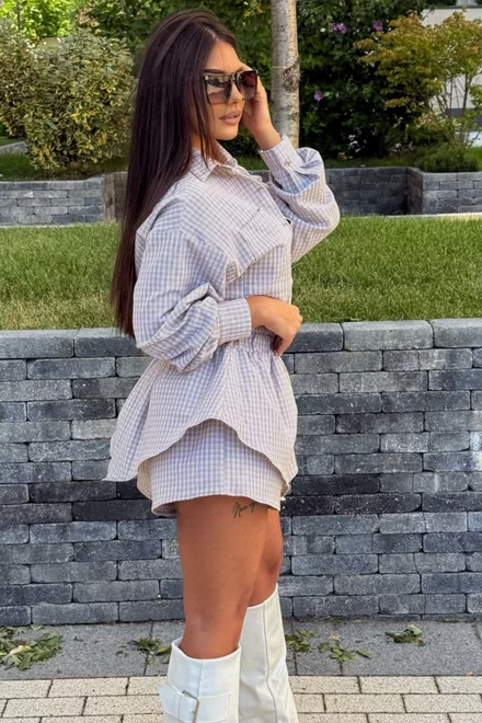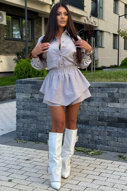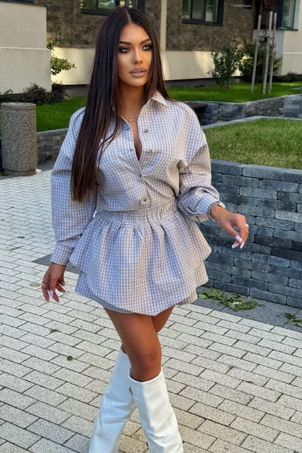 Compleu de Dama, din Stofa de Bumbac Premium , Doua Piese, Camasa si Fusta Pantalon, in Carouri, Vellymore, Bej