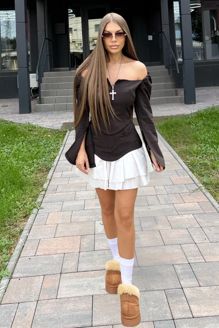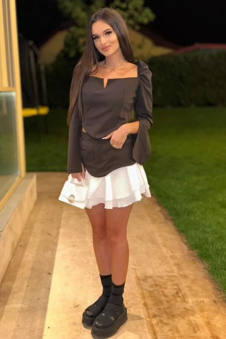 Compleu de Dama, Doua Piese, din Bistrech, Top pe Umeri si Fusta cu Poplin Alb, Masha, Maro Inchis