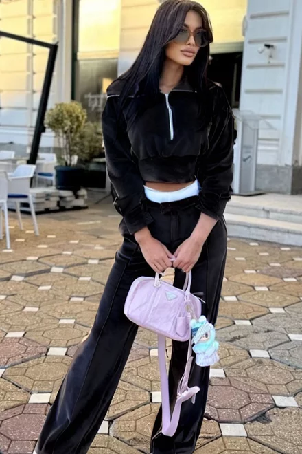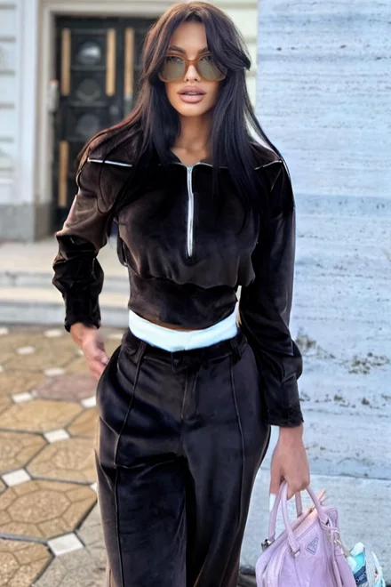 Compleu Lejer de Dama , din Doua Piese, Pantalon cu Betelie Dubla si Bluza cu Inchidere Fermoar, din Catifea, Riley ,Negru